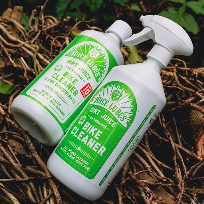 The Dirt Juice Double Pack gives you a bottle of Dirt Juice Bike Wash with a spray trigger and a bottle of Dirt Juice Super Concentrate.