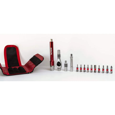The T-Ratchet uses interchangeable magnetic components to convert from a screwdriver to ratchet, to ratcheting T-Handle in seconds, which gives the user the ability to have several tools at once in an extremely small package. The tool, which includes the ratchet, an extender, Ti-Torque and bits sized H2, H2.5, H3, H4, H5, H6, T10, T20, T25 and Phillips H2; then breaks down into a trademark SILCA Duck waxed canvas carrying case measuring 120mm x 70mm x 30mm which means it will easily disappear into a jersey pocket. Lastly, thanks to its Titanium and Aluminum construction, Ti-Torque weighs in at a mere 30 grams meaning you’ll hardly notice it’s there until you need it.